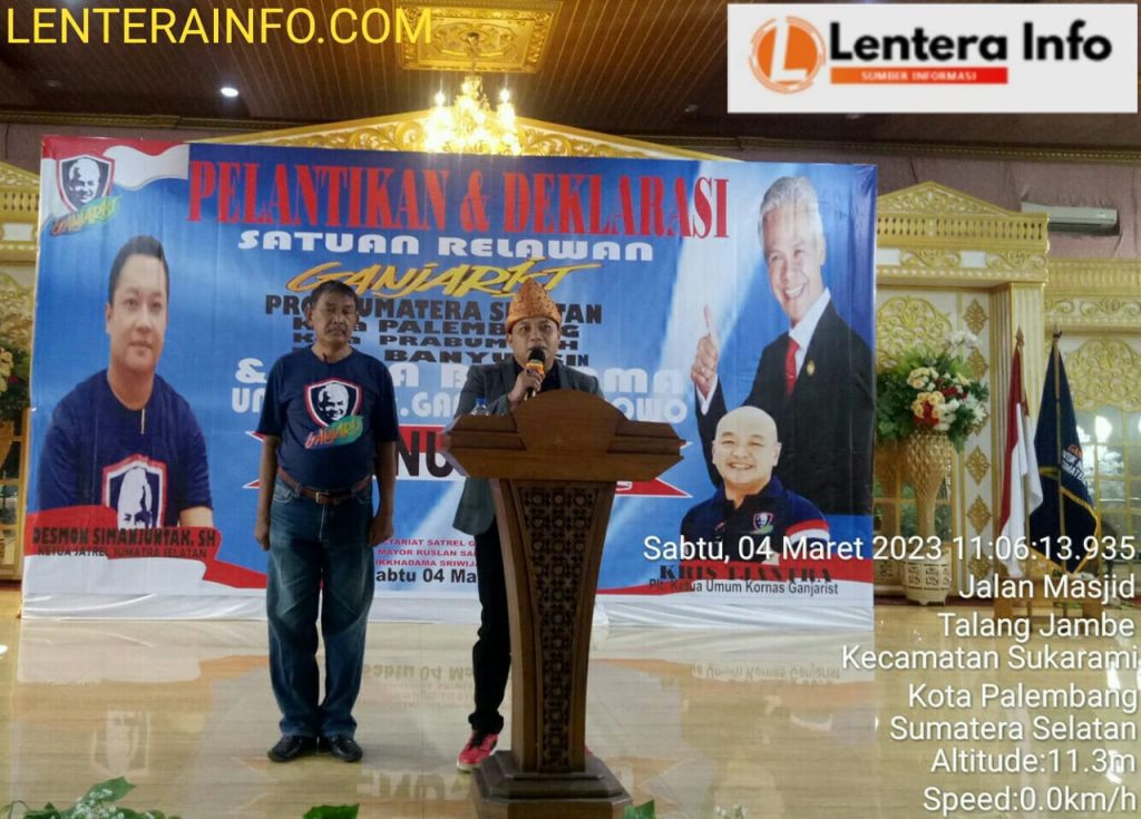 “Dalam acara Pelantikan dan Deklarasi Satuan Relawan Ganjarist Sumatera Selatan,kota Palembang,prabumuli,kabupaten banyuasin, di hadiri Ketua Umum PLT Kris Tjantra ,serta jajaran pengurus Ganjarist, dan pengurus-pengurus dari kabupaten Banyuasin hadir dalam acara tersebut,