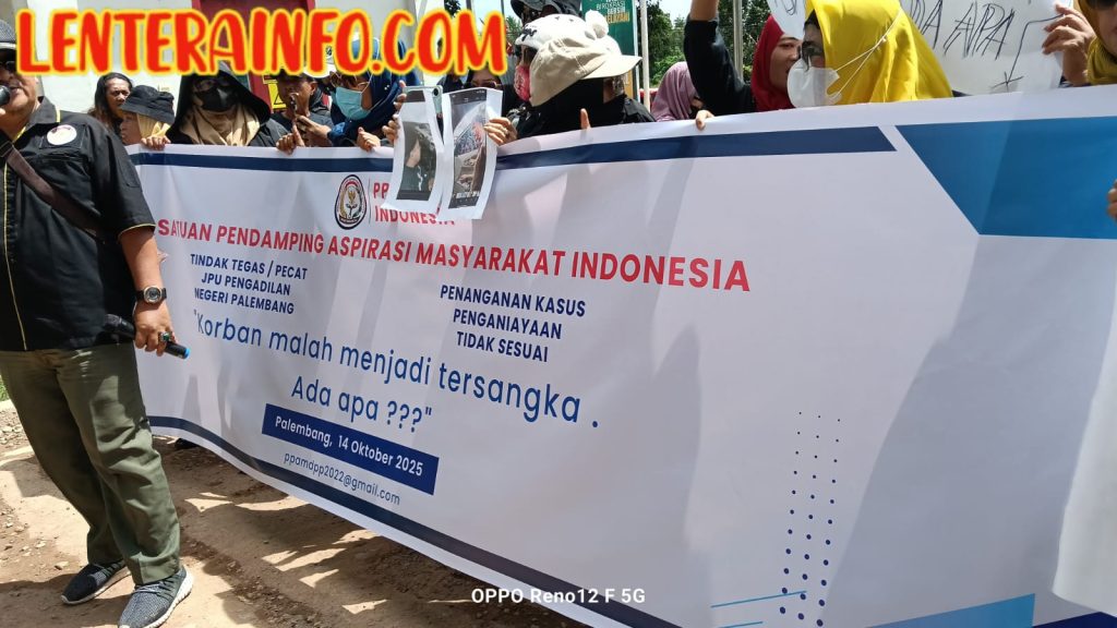 Lenterainfo.com – Palembang,Ratusan massa dari Persatuan Pendamping Aspirasi Masyarakat Indonesia (PPAMI) menggelar aksi damai di halaman Kejaksaan Tinggi Sumatera Selatan (Kejati Sumsel), Selasa (14/10/2025).Aksi tersebut menyoroti penanganan kasus dugaan penganiayaan yang dinilai janggal karena korban justru ditetapkan sebagai tersangka.